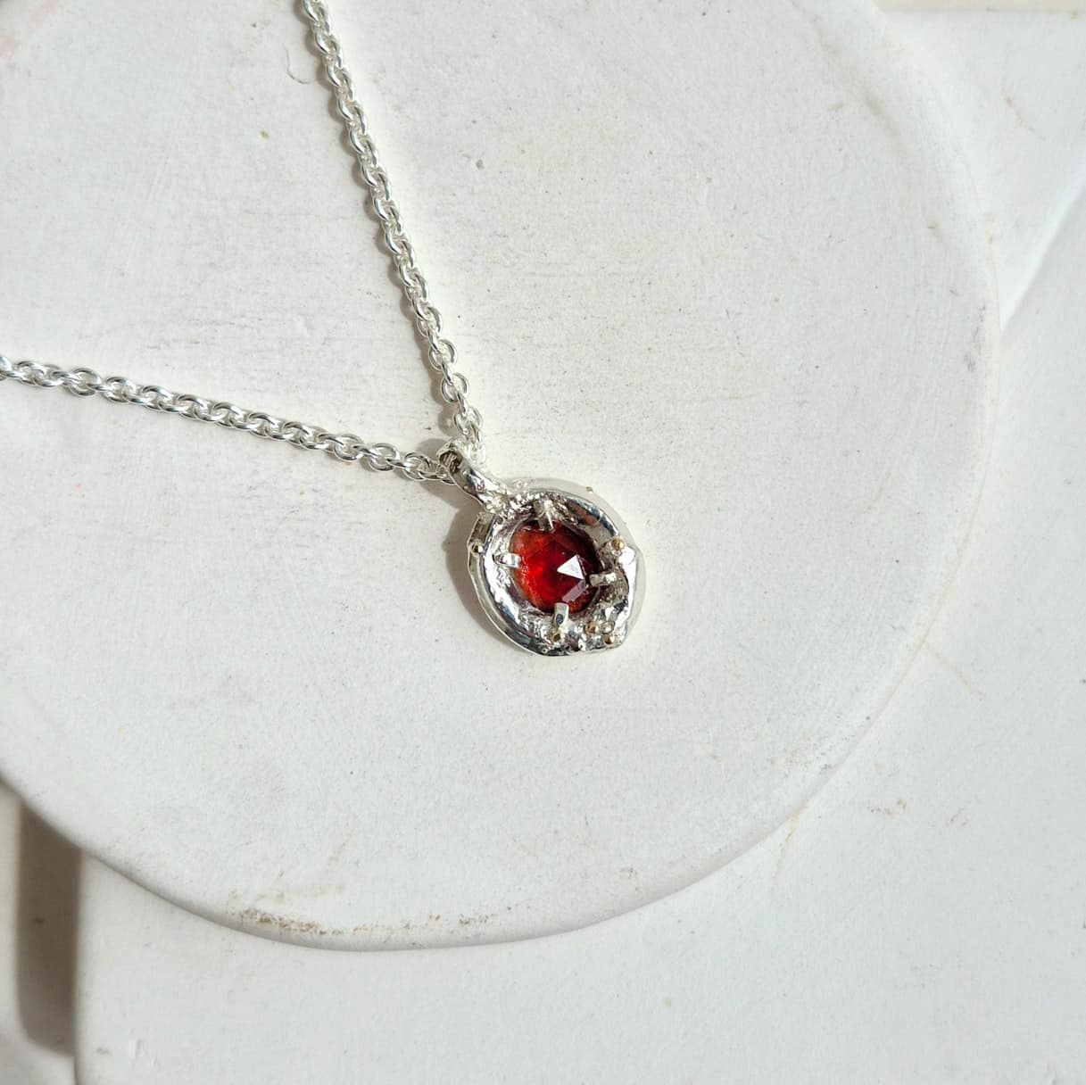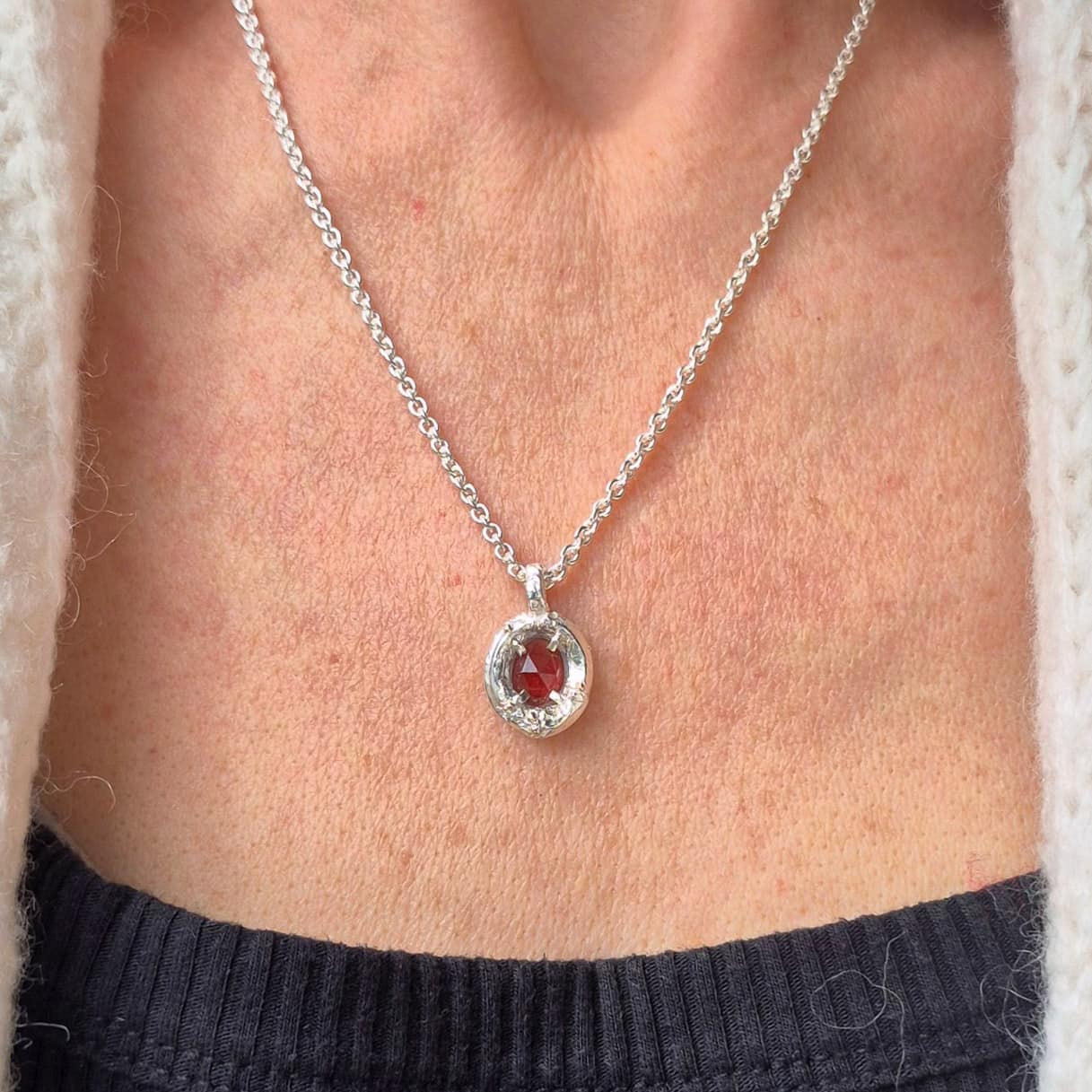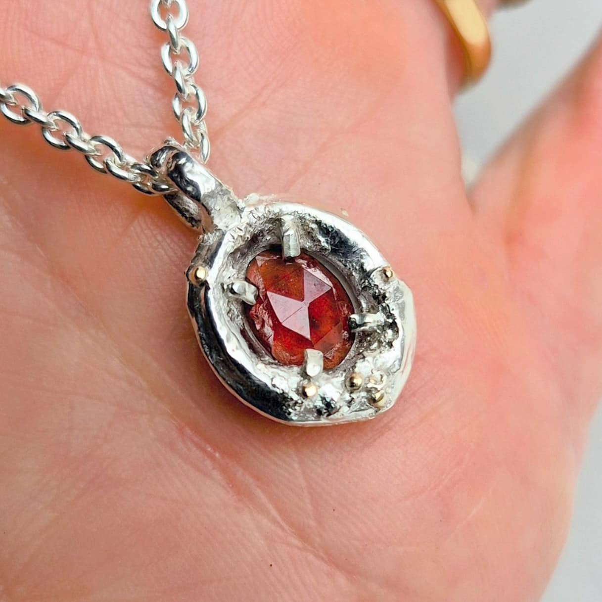 This one-of-a-kind necklace combines the lush red tones of Garnet, encapsulated in a completely bespoke and individually handmade Silver setting that sparkles 9ct Yellow Gold embellishments.
